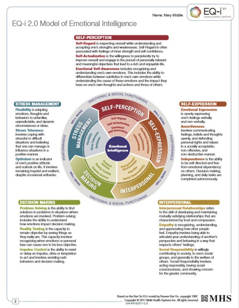 Dr. Reuven Bar-On, a pioneer in the field of emotional intelligence, developed the EQ-I Bar-On Emotional Quotient Inventory, which has been developed into the EQi 2.0 (Emotional Intelligence Quotient Inventory). It measures 5 categories with 15 competencies: